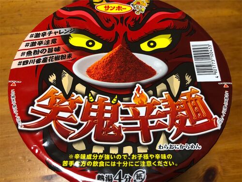 読みに来ていただきありがとうございます。 激辛フードファイタークッキング父ちゃんです。 帰りに寄ったスーパーで見つけちゃったんだけどね。 すげぇ眼力だな。 わかったよ買っていくからさそんなに見るなよ。 本日紹介するのは『笑鬼辛麺』尖ったパッケー…